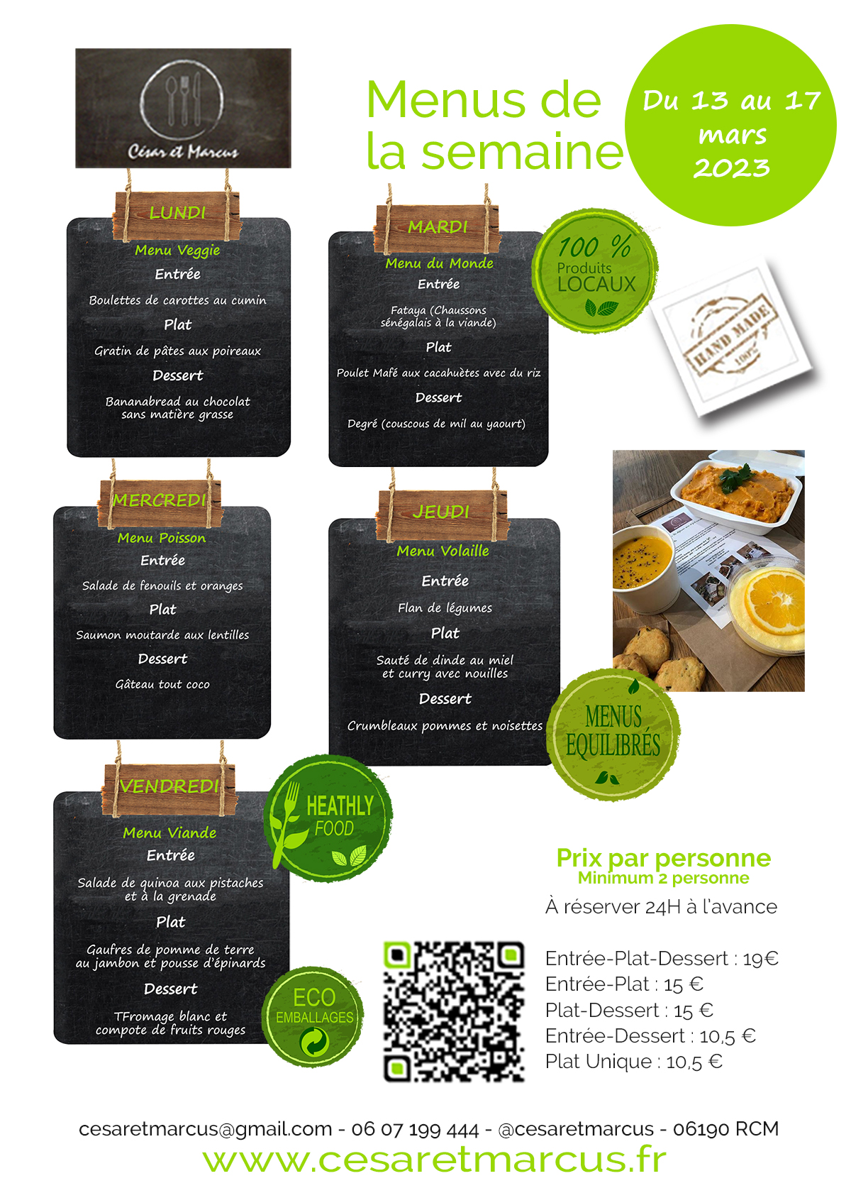 Découvrez nos menus de la semaine 11 du 13 au 17 mars 2023. Commandez 24H à l’avance et régalez-vous!