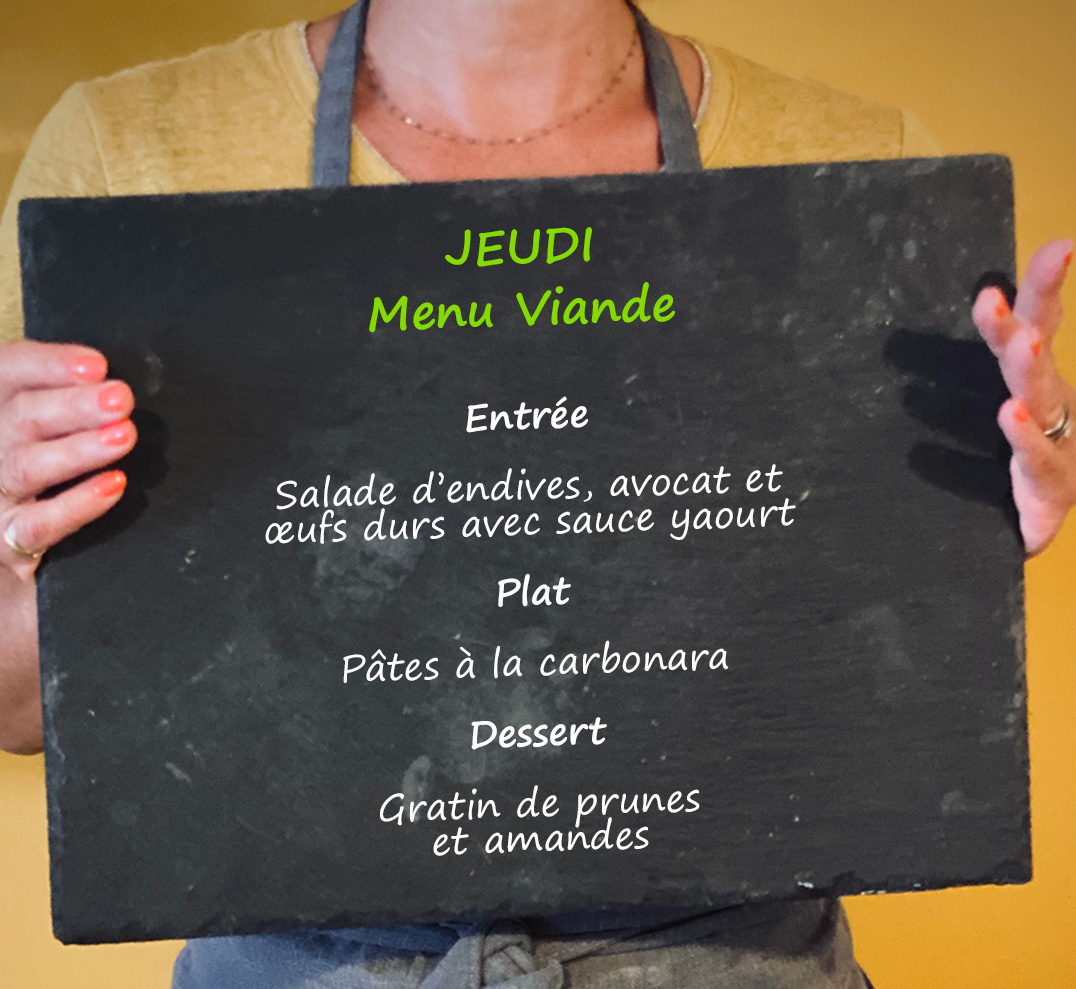 Menu Viande Entrée : Salade d’endives, avocat et œufs durs avec sauce yaourt Plat : Pâtes à la carbonara Dessert : Gratin de prunes et amandes