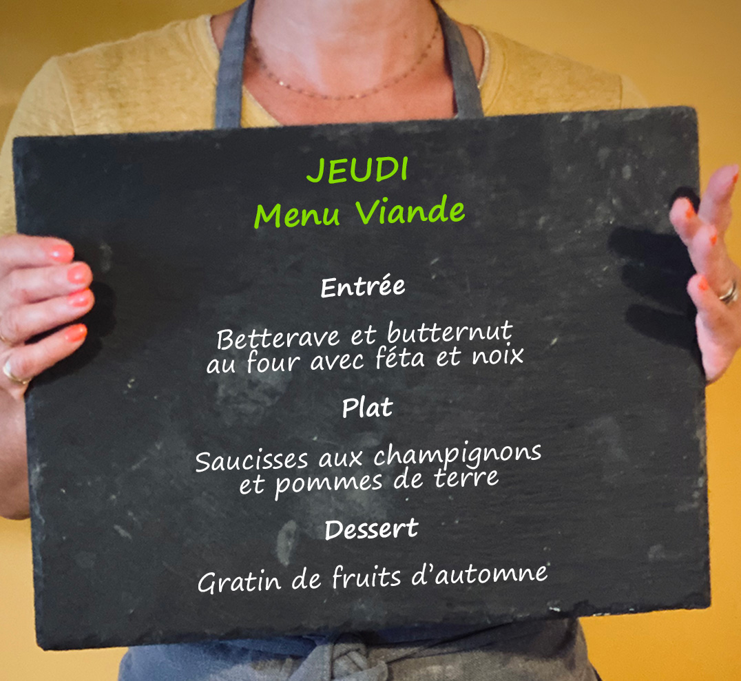 Menu Viande Entrée : Betterave et butternut au four avec féta et noix Plat : Saucisses aux champignons et pommes de terre Dessert : Gratin de fruits d’automne