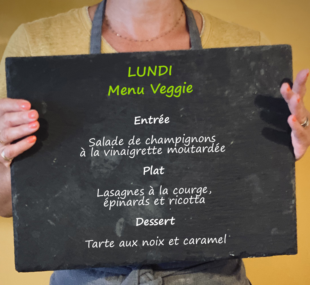Menu Veggie Entrée : Salade de champignons à la vinaigrette moutardée Plat : Lasagnes à la courge, épinards et ricotta Dessert : Tarte aux noix et caramel
