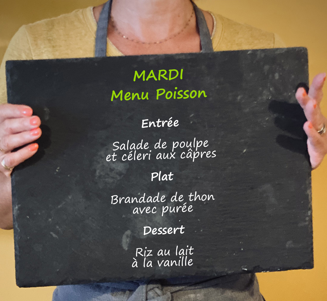 Menu Poisson Entrée : Salade de poulpe et céleri aux câpres Plat : Brandade de thon avec purée Dessert : Riz au lait à la vanille