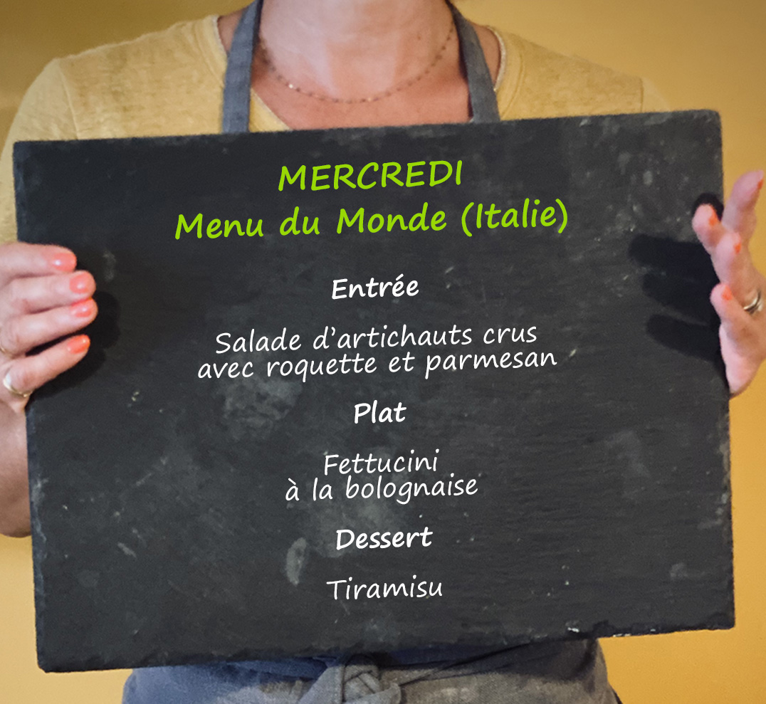 Menu du Monde (Italie) Entrée : Salade d’artichauts crus avec roquette et parmesan Plat : Fettucini à la bolognaise Dessert : Tiramisu