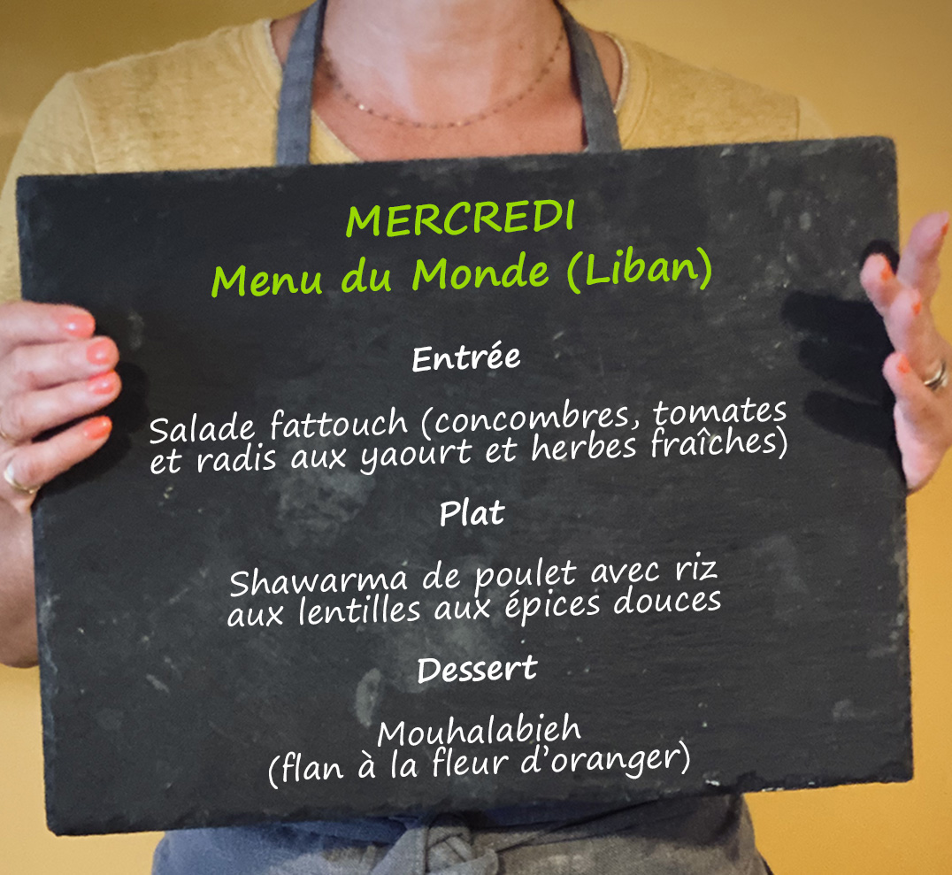 Menu du Monde (Liban) Entrée : Salade fattouch (concombres, tomates et radis aux yaourt et herbes fraîches) Plat : Shawarma de poulet avec riz aux lentilles aux épices douces Dessert : Mouhalabieh (flan à la fleur d’oranger)