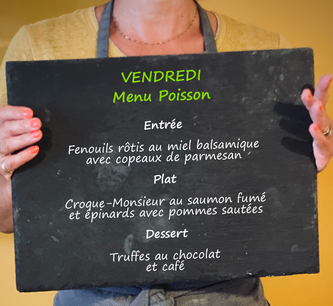 Menu Poisson Entrée : Fenouils rôtis au miel balsamique avec copeaux de parmesan Plat : Croque-Monsieur au saumon fumé et épinards avec pommes sautées Dessert : Truffes au chocolat et café